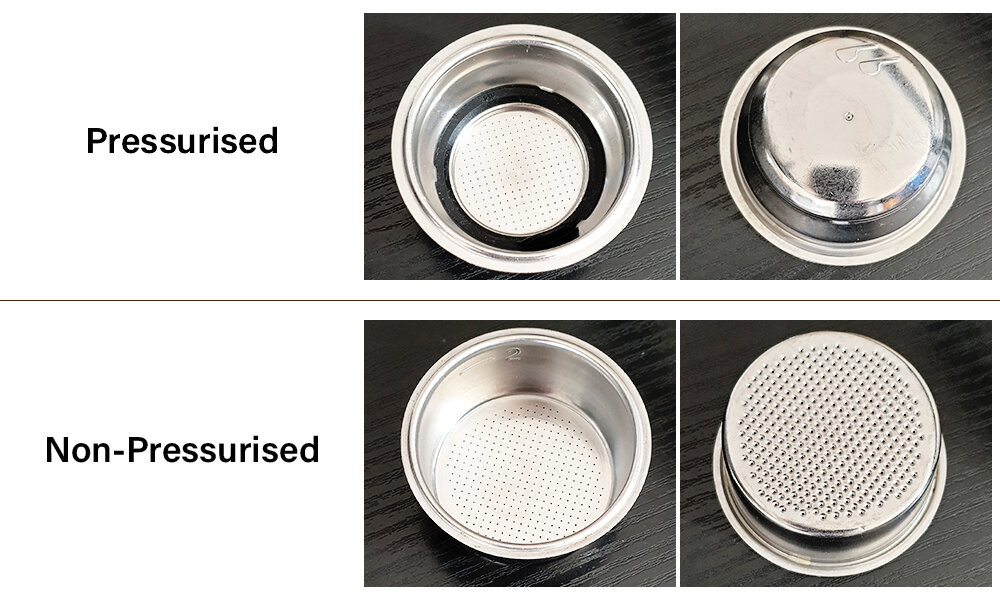 The difference between pressurised and precision baskets is that pressurised baskets are designed for use with coarsely ground coffee. They are often used in entry-level espresso machines or with lower quality grinders that can't grind fine enough or the coffee machine can't push water through a finer grind. These baskets offer more resistance to achieve an appropriate flow rate and build the pressure needed to extract CO2 for crema. However, I still recommend investing in a better grinder and using precision baskets for the best results.